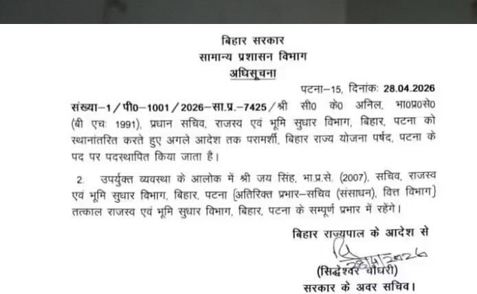 सरकारी आदेश के अनुसार, 1991 बैच के आईएएस अधिकारी सीके अनिल को उनके वर्तमान पद से हटाकर बिहार राज्य योजना परिषद में परामर्शी के रूप में नियुक्त किया गया है। वहीं, विभाग की जिम्मेदारी अब 2007 बैच के आईएएस अधिकारी जय सिंह को सौंपी गई है, जो पहले से ही वित्त विभाग (संसाधन) के सचिव का अतिरिक्त प्रभार संभाल रहे हैं।