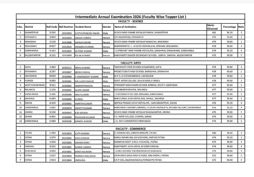 साइंस संकाय में समस्तीपुर के आदित्य प्रकाश अमन ने 96.20% (481 अंक) के साथ पूरे बिहार में पहला स्थान हासिल किया। दूसरे स्थान पर साक्षी कुमारी (सीतामढ़ी) और सपना कुमारी (नवादा) रहीं, जिन्होंने 95.80% अंक प्राप्त किए। तीसरे स्थान पर बेगूसराय की अनामिका कुमारी ने 95.60% के साथ जगह बनाई। वहीं, दरभंगा के सत्यम कुमार और मुजफ्फरपुर के पालक कुमारी ने भी टॉपर्स सूची में स्थान हासिल किया।