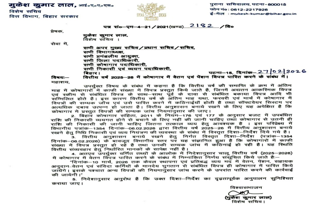 NEWS PR डेस्क: वित्तीय वर्ष 2025-26 की समाप्ति से पहले बिहार सरकार ने वित्तीय अनुशासन बनाए रखने के लिए सख्त कदम उठाया है। वित्त विभाग के विशेष सचिव मुकेश कुमार लाल द्वारा जारी पत्र के अनुसार 10 मार्च तक वेतन को छोड़कर अन्य सभी प्रकार की निकासी पर रोक लगा दी गई है।