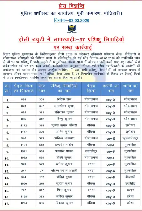 NEWS PR डेस्क: पूर्वी चंपारण से पुलिस महकमे की बड़ी खबर सामने आई है। होली के मौके पर ड्यूटी से नदारद रहने वाले 37 कॉन्स्टेबलों को तत्काल प्रभाव से सस्पेंड कर दिया गया है।