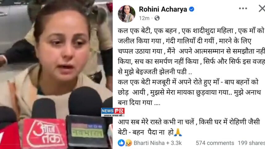वही रोहणी आचार्य अपने फेसबुक अकाउंट पर भावुक होते हुए लिखा कि ” कल एक बेटी, एक बहन, एक शादीशुदा महिला, एक मां को जलील किया गया गंदी गालियां दी गई करने के लिए चप्पल उठाया गया, मैंने अपने आत्म सम्मान से समझौता नहीं किया सच का समर्पण नहीं किया।