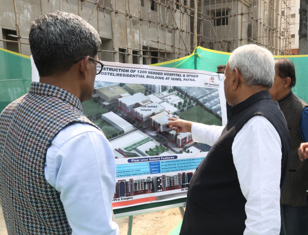 NEWS PR डेस्क: पटना, 21 फरवरी 2026 मुख्यमंत्री श्री नीतीश कुमार ने आज इंदिरा गांधी आयुर्विज्ञान संस्थान (आई०जी०आई०एम०एस०), शेखपुरा, पटना में 1200 शैय्या के नये अस्पताल भवन सह आवसीय भवन के निर्माण कार्य का जायजा लिया। अधिकारियों ने मुख्यमंत्री को बताया कि इसका निर्माण कार्य तेजी से चल रहा है और जल्द पूर्ण हो जायेगा। मुख्यमंत्री ने अधिकारियों को निर्देश देते हुये कहा कि इसका निर्माण कार्य जल्द पूर्ण करें। इस अत्याधुनिक मल्टी सुपर स्पेशियलिटी अस्पताल का निर्माण कार्य पूर्ण होने से मरीजों को इलाज में और सहूलियत होगी। साथ ही बिहार की स्वास्थ्य सेवायें बेहतर और उन्नत होंगी।