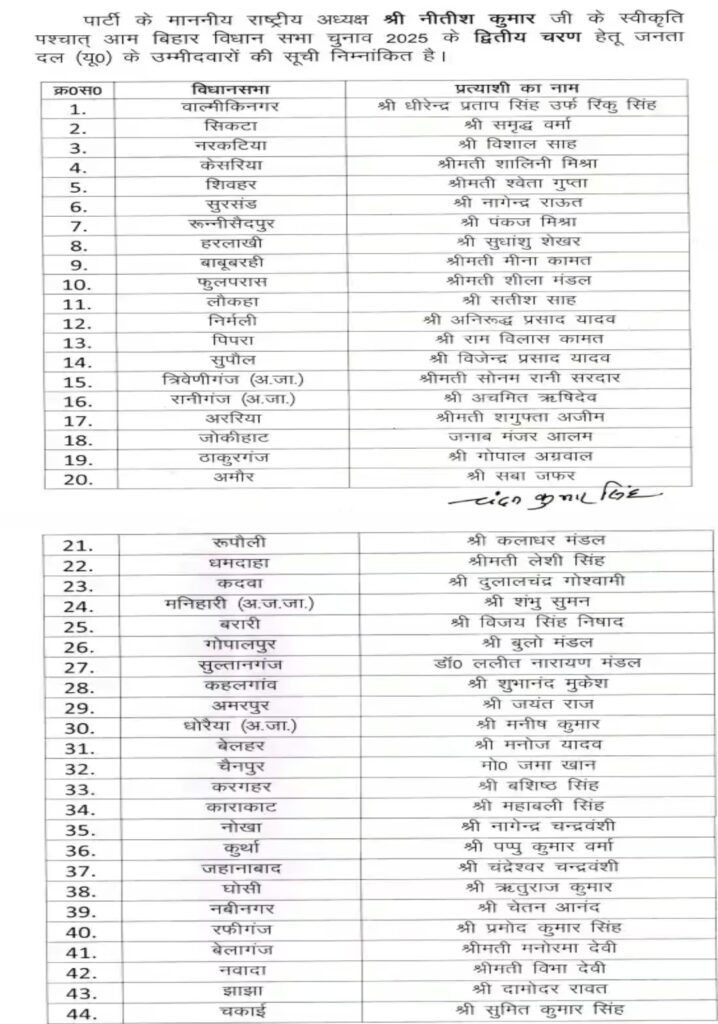 मुख्यमंत्री नीतीश कुमार की पार्टी जेडीयू (जनता दल यूनाइटेड) ने विधानसभा चुनाव के लिए अपनी दूसरी और अंतिम उम्मीदवार सूची जारी कर दी है।