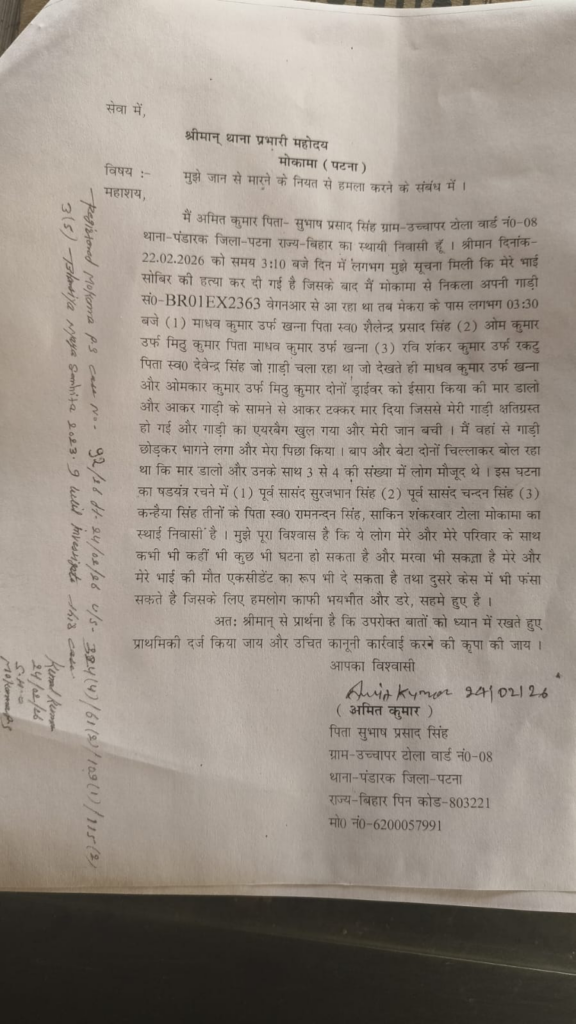 अमित कुमार ने आरोप लगाया है कि 22 फरवरी की दोपहर करीब 3:10 बजे उन्हें सूचना मिली कि उनके भाई शोभीर उर्फ सुमित की हत्या कर दी गई है। जब वे अपनी कार से मोकामा से पंडारक की ओर आ रहे थे, तभी मेकरा के पास आरोपियों ने उनकी गाड़ी को टक्कर मार दी।