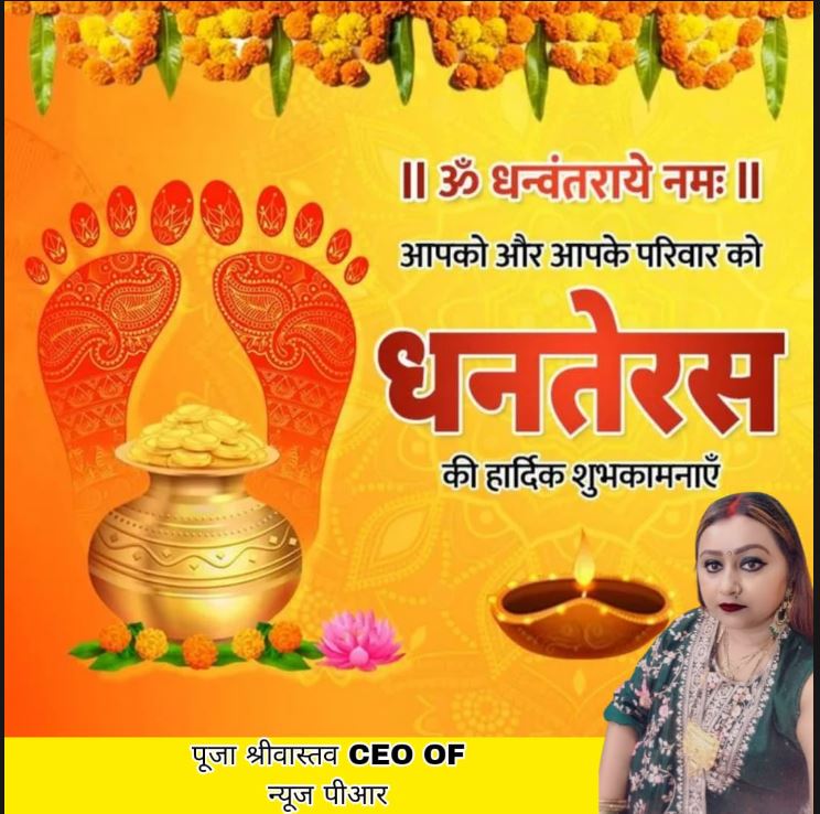 पटना: देशभर में आज धनतेरस का पर्व हर्षोल्लास के साथ मनाया जा रहा है। इस शुभ अवसर पर NewsPR की CEO पूजा श्रीवास्तव ने देशवासियों और पाठकों को अपनी हार्दिक शुभकामनाएँ दी हैं।