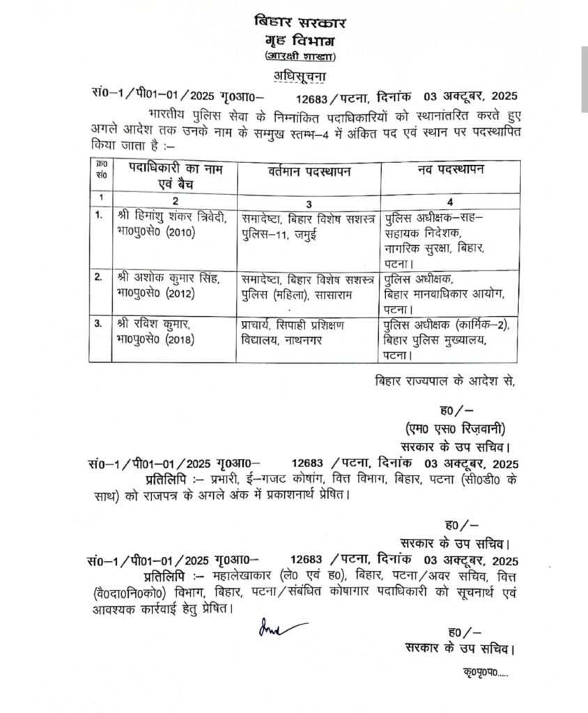 NEWS PR DESK- बड़ी खबर निकलकर सामने आ रही है आपको बता दे की विधानसभा चुनाव से पहले बिहार में तीन IPS अधिकारियों समेत बड़े पैमाने पर DSP स्तर के अधिकारियों का तबादला कर दिया गया।