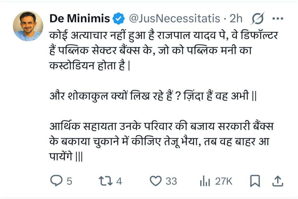 हालांकि, तेज प्रताप यादव की इस पोस्ट के बाद सोशल मीडिया पर विवाद खड़ा हो गया। एक तरफ कुछ लोग जहाँ उनकी इस कार्य के लिए सराहना की तो वही दूसरी तरफ कई यूजर्स ने उनके शब्दों के चयन और मदद के उद्देश्य पर सवाल उठाए। कुछ लोगों ने यह आपत्ति जताई कि राजपाल यादव जीवित हैं, ऐसे में ‘शोकाकुल परिवार’ शब्द का इस्तेमाल क्यों किया गया। वहीं, कई यूजर्स ने सुझाव दिया कि यह राशि परिवार को देने के बजाय बैंक का बकाया चुकाने में दी जानी चाहिए, ताकि राजपाल यादव को जेल से राहत मिल सके।