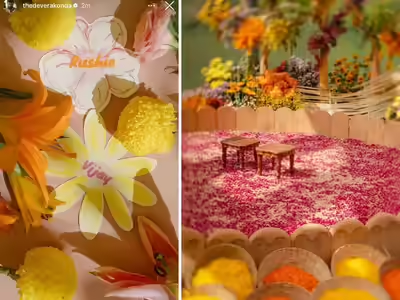 इन तस्वीरों में चारों तरफ रंग-बिरंगे फूल और हल्दी की टोकरियां नजर आ रही हैं। फूलों के बीच दूल्हा और दुल्हन के लिए लकड़ी के दो छोटे स्टूल रखे गए थे। इस जगह को पीले और नारंगी गेंदे के फूलों की पंखुड़ियों वाली टोकरियों से सजाया गया था। एक अन्य स्टोरी में, एक्टर ने फूलों के आकार के व्यक्तिगत ‘नेम प्लेकार्ड’ की तस्वीर दिखाई।