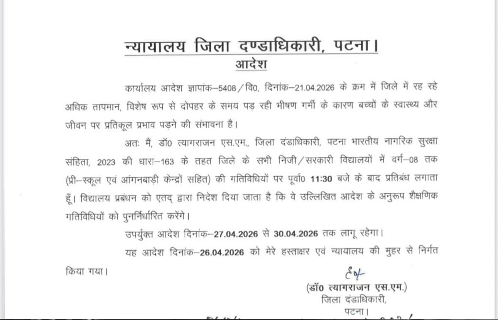 NEWS PR डेस्क: पटना, 26 अप्रैल। बिहार में लगातार बढ़ती गर्मी और तेज धूप को देखते हुए जिला प्रशासन ने स्कूली बच्चों की सुरक्षा के लिए बड़ा कदम उठाया है। पटना के जिलाधिकारी ने आदेश जारी करते हुए सभी सरकारी और निजी स्कूलों के समय में अस्थायी बदलाव किया है।
