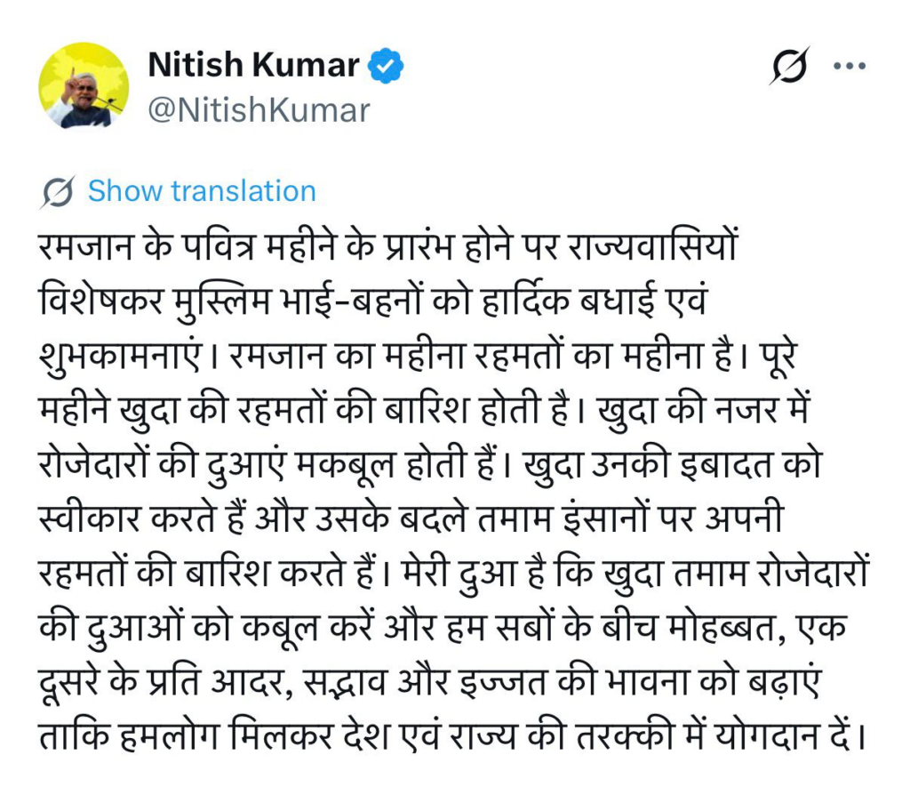 NEWS PR डेस्क: मुख्यमंत्री नीतीश कुमार ने पवित्र माह रमजान के शुरुआत पर प्रदेशवासियों, खासकर मुस्लिम समुदाय को हार्दिक बधाई और शुभकामनाएं दी हैं। उन्होंने सोशल मीडिया मंच ‘एक्स’ के माध्यम से जारी अपने संदेश में कहा कि रमजान रहमतों और इबादत का महीना है, जिसमें खुदा की विशेष कृपा बरसती है। रोजेदारों की दुआएं अल्लाह की नजर में मकबूल होती हैं और उनकी इबादत स्वीकार की जाती है।