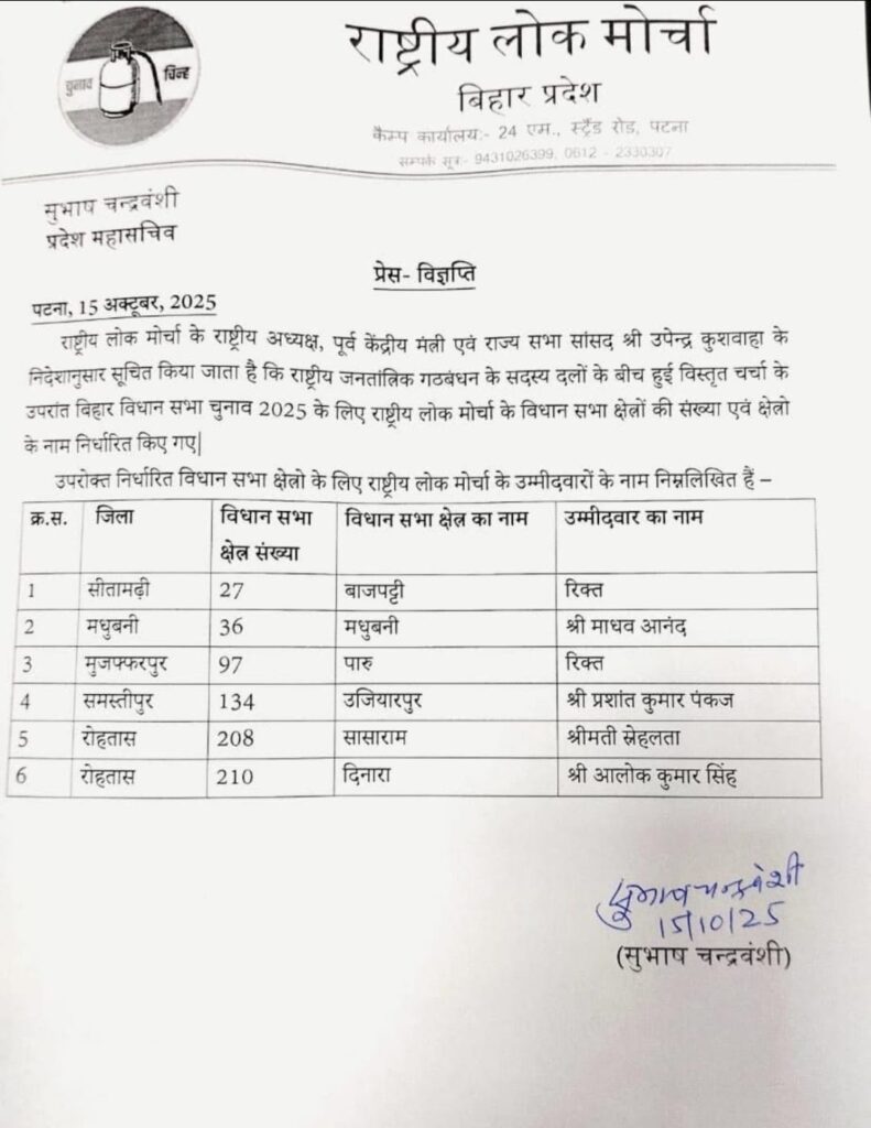 वही आपको बता दे कि जदयू भाजपा चिराग पासवान की पार्टी और मांझी की पार्टी सिंबल बांटना शुरू कर दिया है तो वही आपको बता दे की उपेंद्र कुशवाहा की पार्टी ने भी देर रात उम्मीदवारों का नाम घोषित कर दिया है।